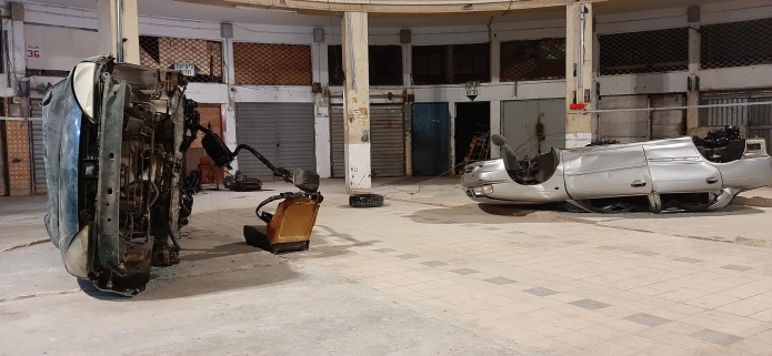 מכוניות פרטיות, זפת, 2019אולם זה מציג 'תאונה מכוונת'. חוסר ההתאמה בין המצב הבלתי מבוקר והבלתי מכוון של תאונה, לבין ההתקנה המבוקרת והפרופורציונלית של כלי הרכב באולם, מציג מתח בלתי פתור. המכוניות דומות לכרובים בבית המקדש; הזפת הזורחת היא סמל, עניין גולמי של הוויה ומטמורפוזה; מושבי המכונית, הצמיגים וחלקי המנוע משתתפים כולם בעבודת הקודש התמידית הזו.