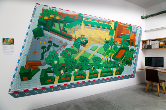 עידו מיכאלי מציג מתווה לעבודת קבע שתוצב על קיר בגן החשמל. חלל העבודה שלו בארטפורט הפך למשרד אדריכלים, בו יפרוס את תוכנית המתאר של העבודה ומחקר אורבני של המקום.